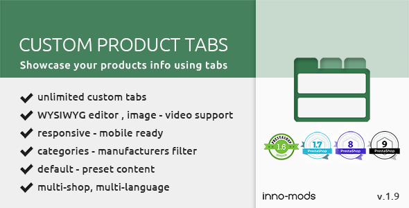 Custom Product Tabs is a premium, multi-shop and multi-language Prestashop plugin than allows you to add unlimited additional tabs to your products. So, get started, create as many tabs as you want and manage them through the easy to use drag-and-drop admin panel of the module. You can add all types of content text-images-videos-script in each of your tabs, and make the best out of your products.